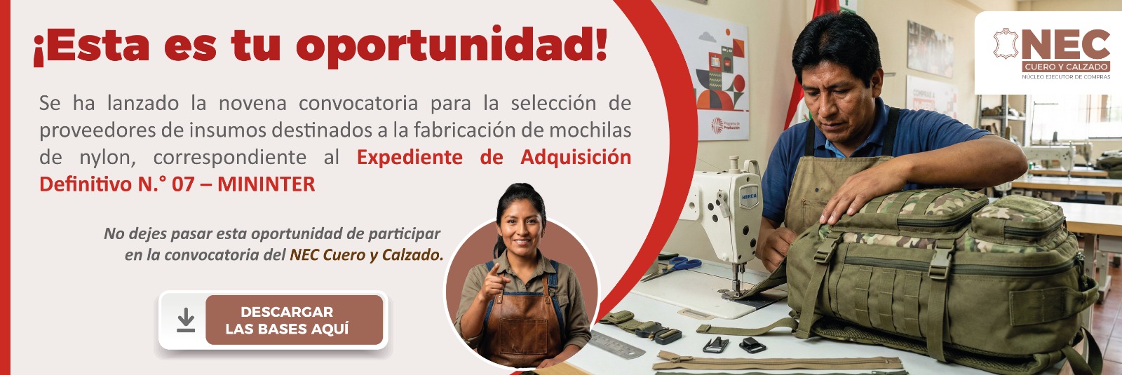 El Programa Nacional Compras a MYPErú (PCMP), a través del Núcleo Ejecutor de Compras (NEC) Cuero y Calzado, lanzó una importante convocatoria para proveedores de insumos y servicios destinados a la...